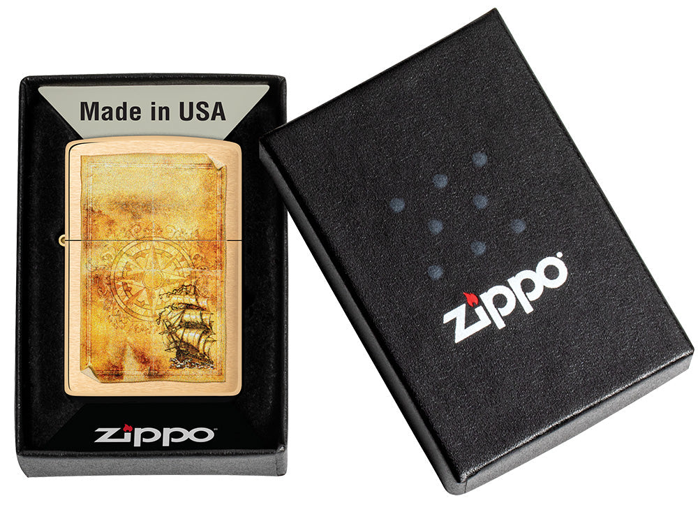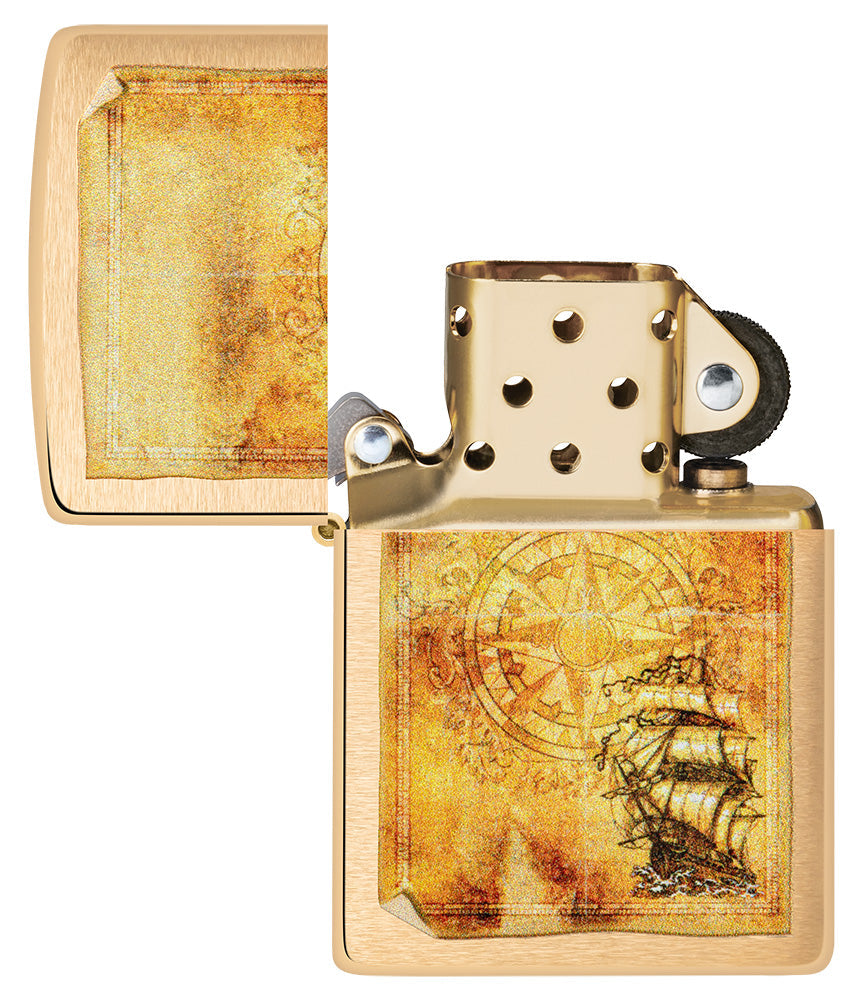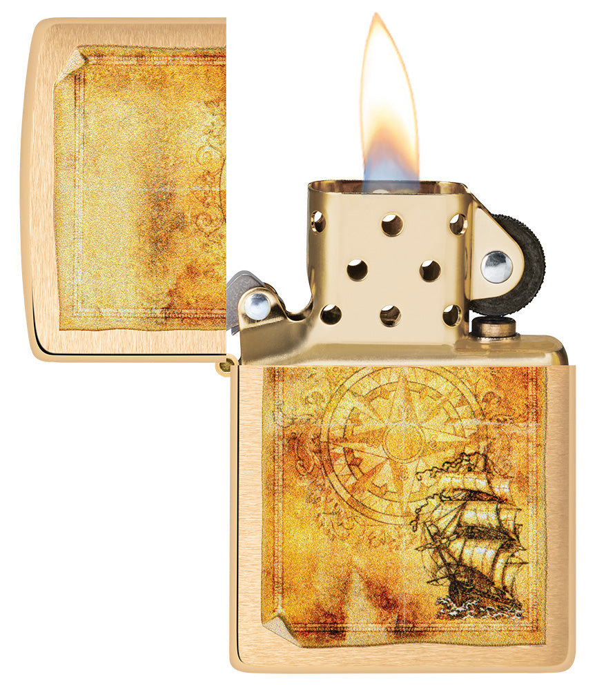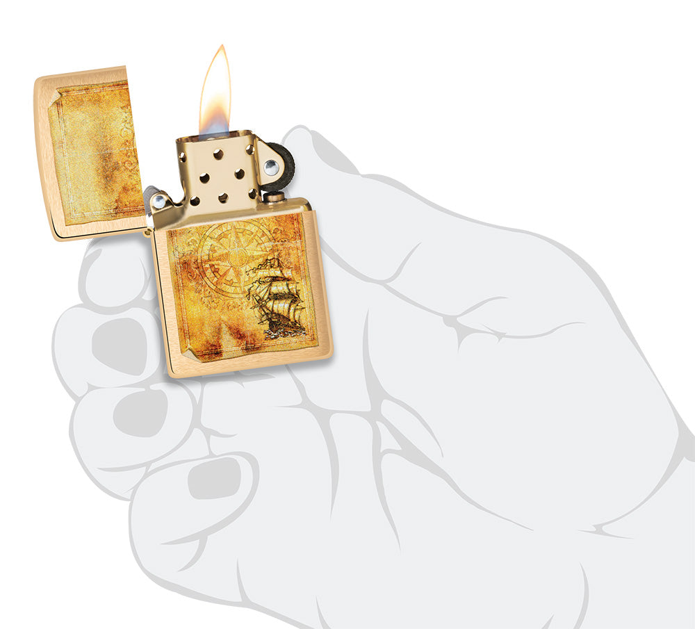 Comience su viaje con este encendedor clásico Brushed Brass. El diseño Color Image se asemeja a un mapa y una brújula desgastados, anclados por un barco que parte en su búsqueda.