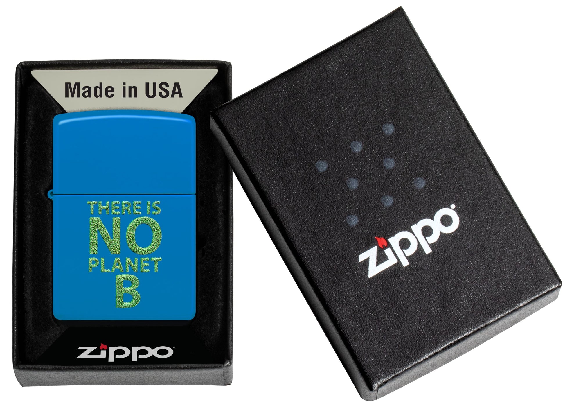 Este encendedor Sky Blue Matte sirve de recordatorio para proteger nuestro único y exclusivo planeta Tierra. En el diseño Texture Print se lee "There is no planet B" en texto tridimensional.