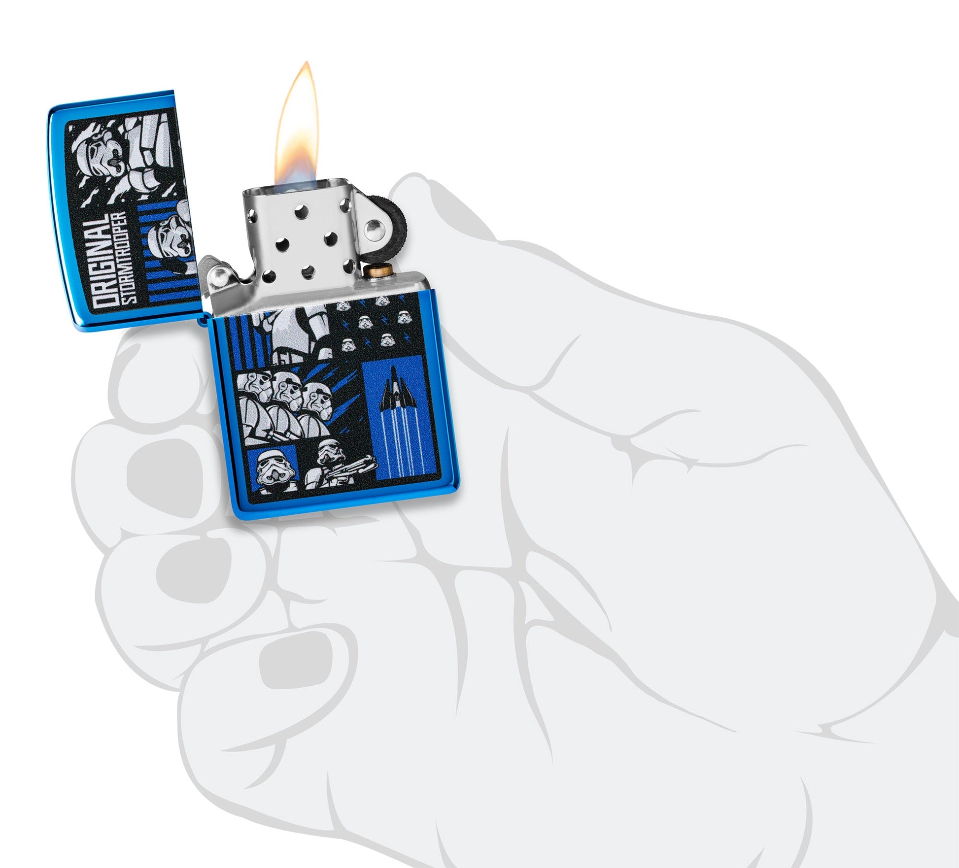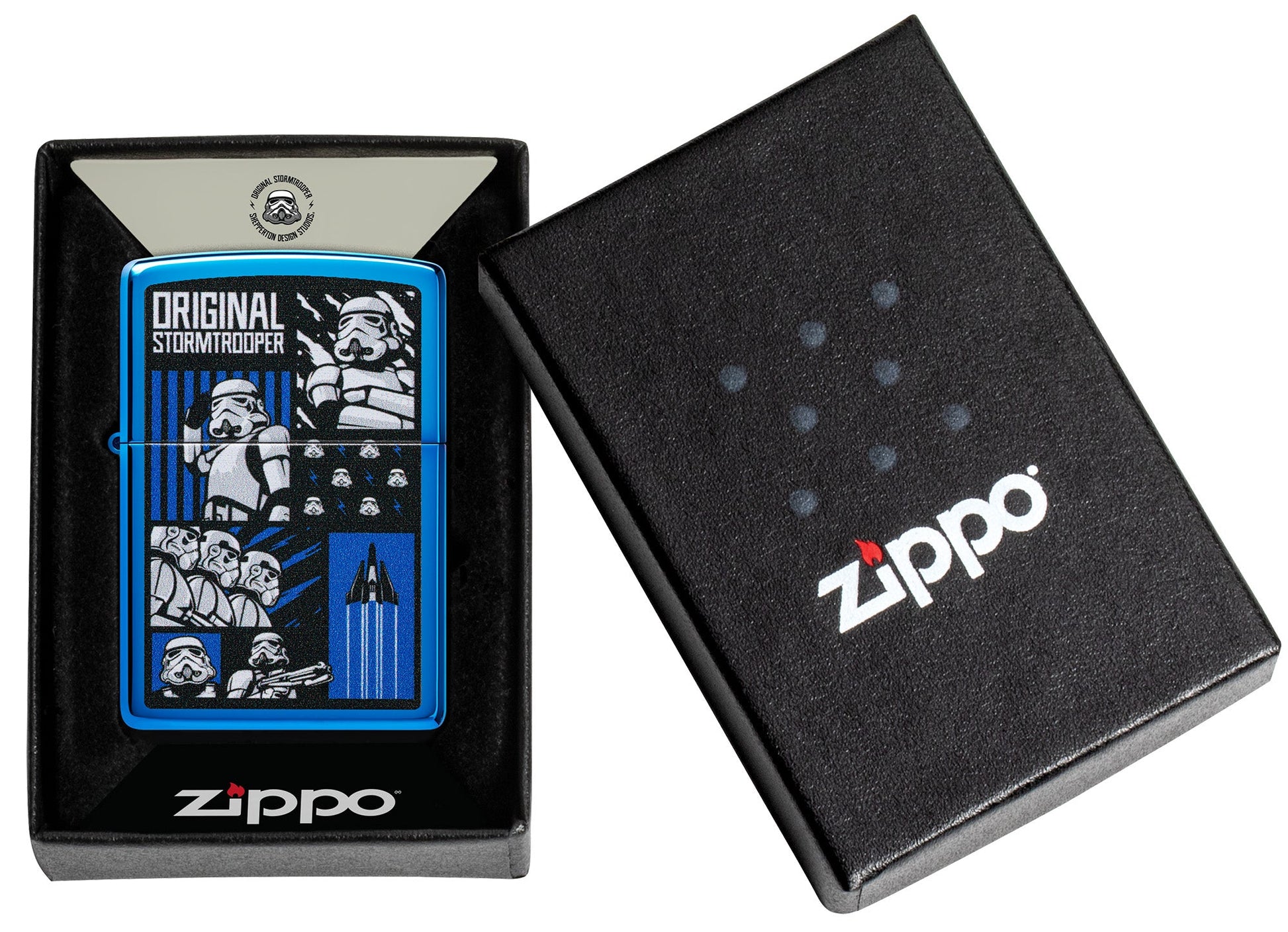 Quizás la fuerza de combate más reconocible de la galaxia, este diseño de Original Stormtrooper se luce a la perfección en este clásico encendedor High Polish Blue. El diseño Color Image muestra un collage de los queridos soldados en una serie de emocionantes escenarios.