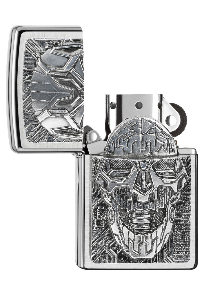 La calavera de un robot domina la superficie de este encendedor Brushed Chrome en un emblema de metal tallado intrincadamente. Bajo la tapa del encendedor se descubre un emblema sorpresa para un truco oculto.