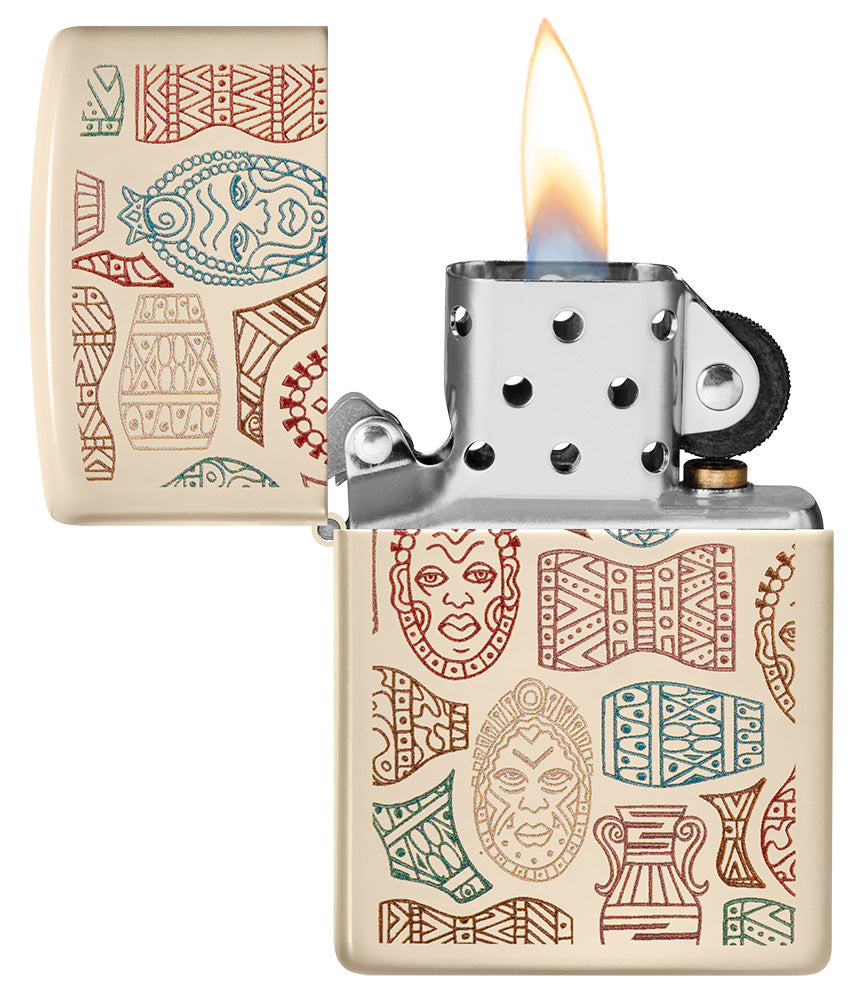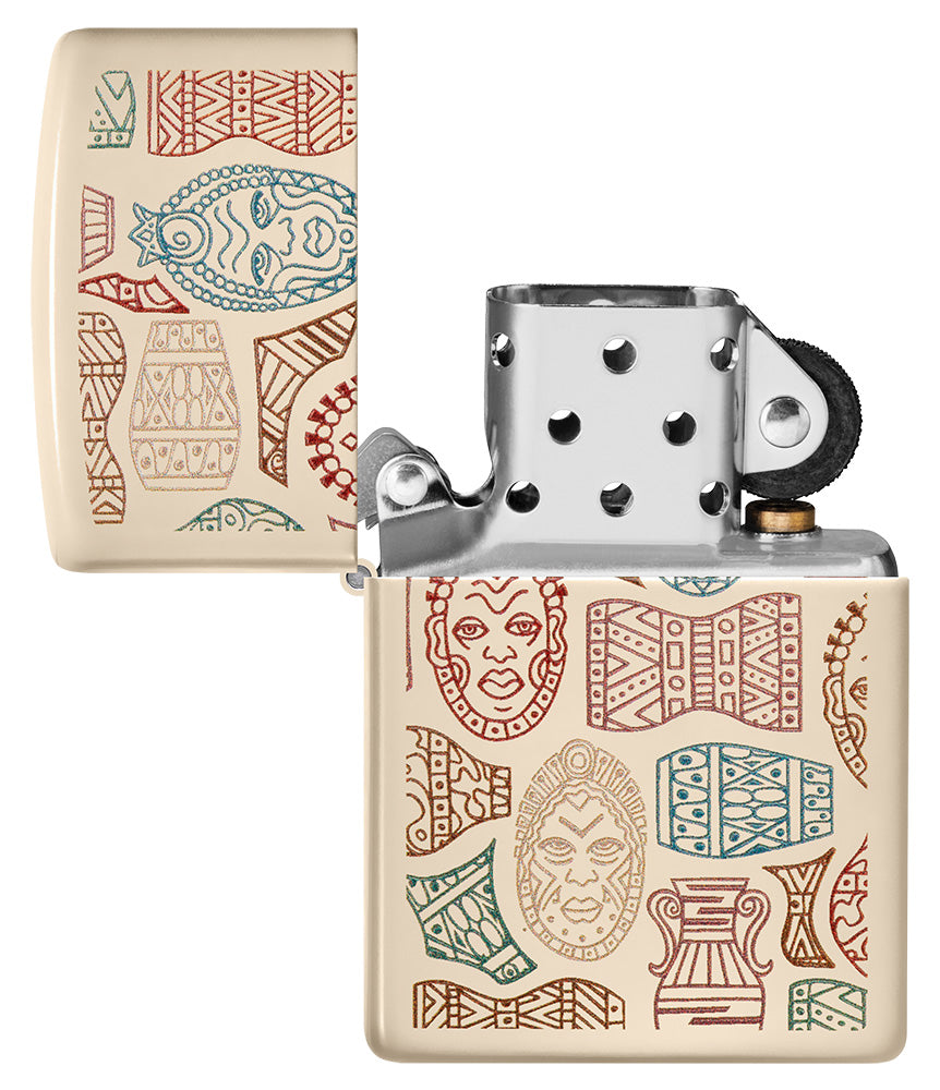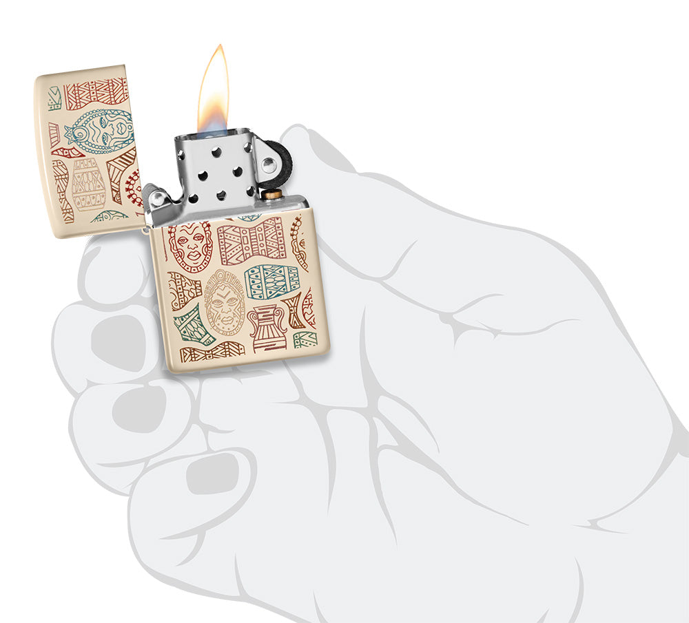 La superficie de color arena confiere al encendedor una estética natural a la par que moderna. El símbolo de inspiración tribal, representado en vivos colores en el encendedor, irradia un aura poderosa y atrae todas las miradas.