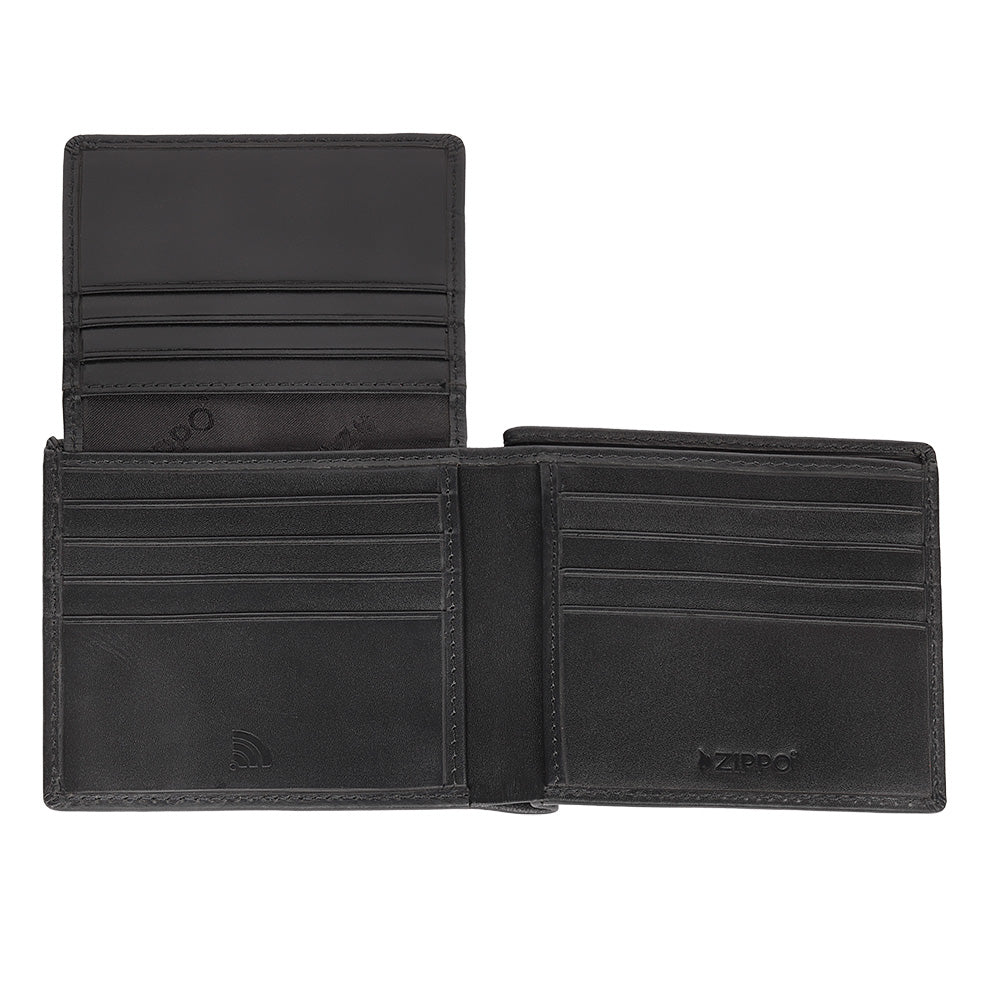 La cartera Signature de Zippo añade un estilo clásico a sus accesorios esenciales del día a día. Con un amplio espacio para billetes y tarjetas de crédito, esta suave cartera de cuero auténtico está decorada con un emblema metálico con la forma de la genuina llama Zippo. Cuenta con tecnología de bloqueo RFID y un lujoso forro de jacquard.