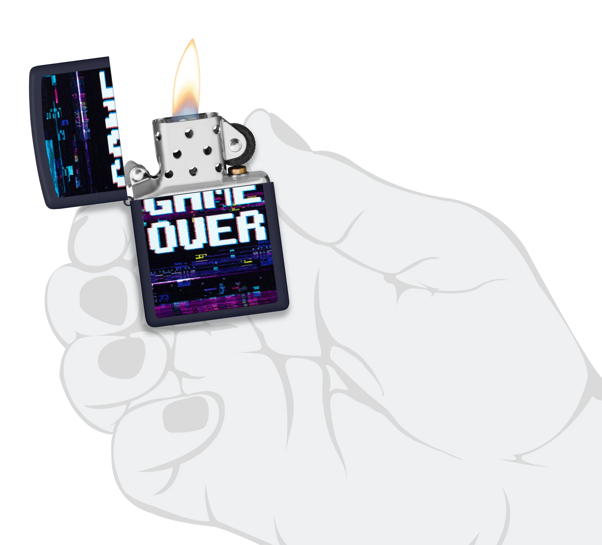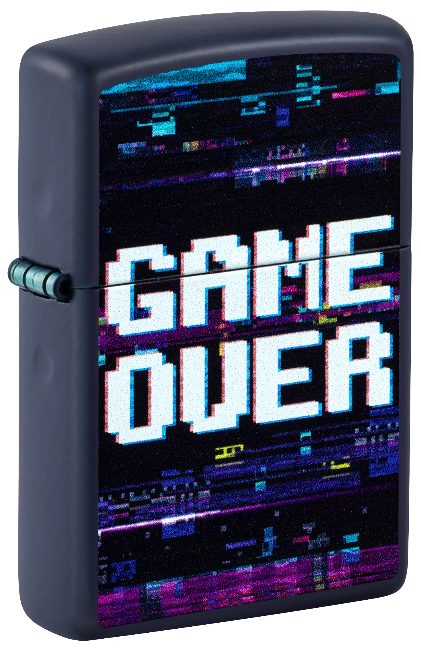 Este clásico encendedor Navy Matte imita su videojuego favorito. "Game Over" aparece inscrito sobre un fondo vibrante y pixelado en un nostálgico diseño Color Image.
