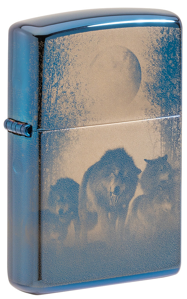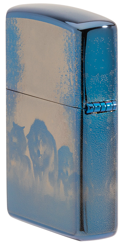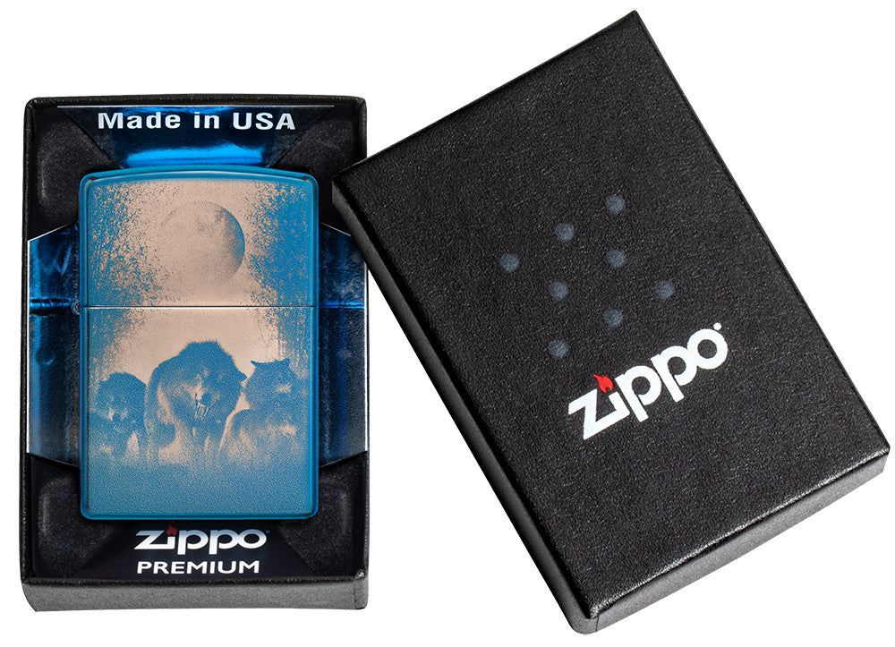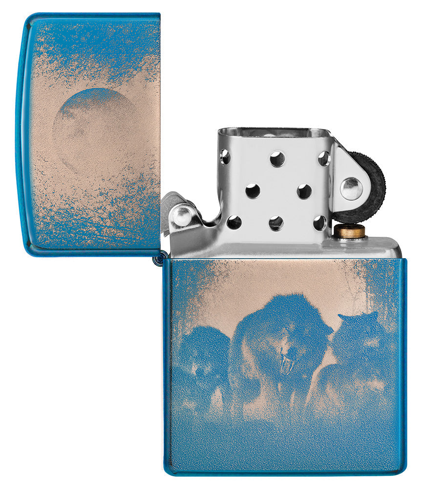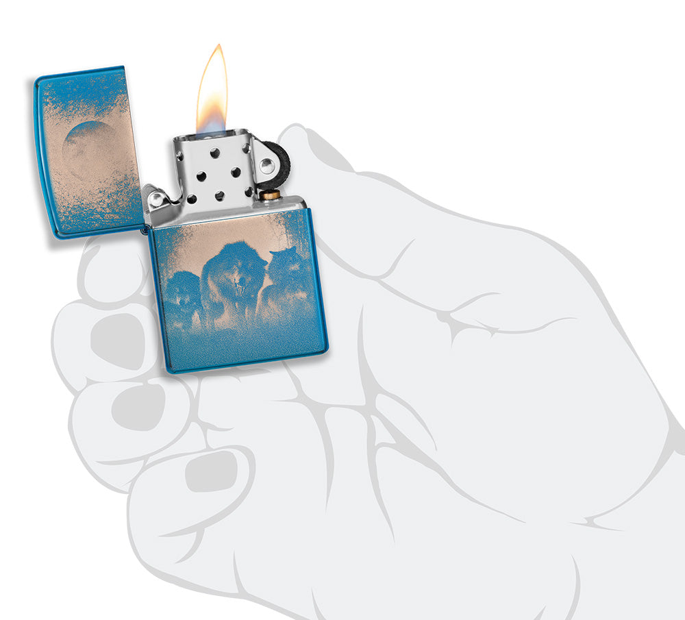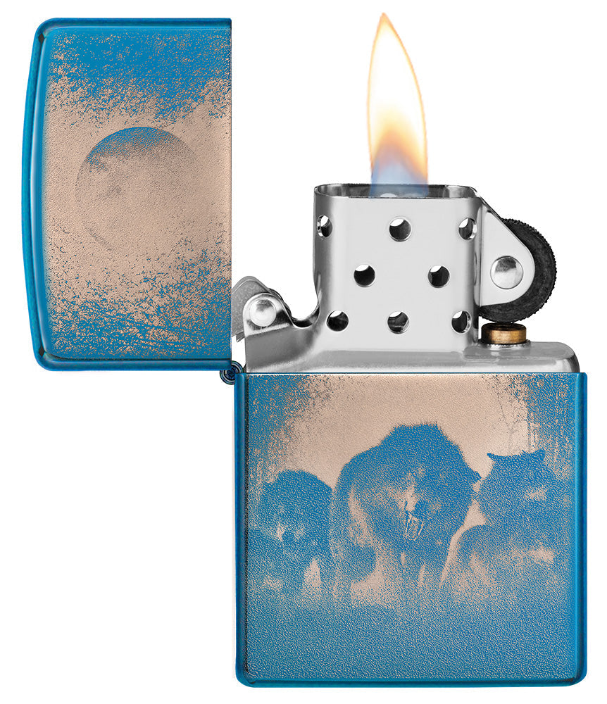 El acabado azul pulido confiere al encendedor un aspecto elegante y atractivo. La detallada foto de la manada de lobos y la luna llena crea una atmósfera cautivadora y capta la belleza salvaje de la naturaleza.